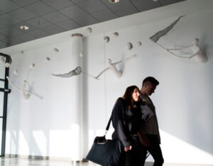 Contexto: Representa tres figuras, que llevan con ellas unas redes, gracias a las cuales capturan los besos que se dan en las despedidas y en las llegadas en el aeropuerto.