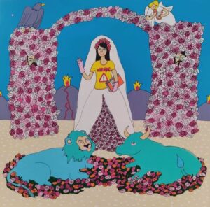 Utilizando el humor y la ironía, se aproxima a los temas controvertidos que nos configuran como individuos y como sociedad: la comunicación, las relaciones, el miedo y la libertad. Detrás de cada obra, se esconde un mensaje de duda, de temor e incertidumbre, que cuestiona cuánto de verdad hay en la imagen que proyectamos. La frustración y la ansiedad de los personajes quedan camufladas tras sonrisas forzadas, plantas, mascotas, decorados y estampados de colores intensos y estridentes.